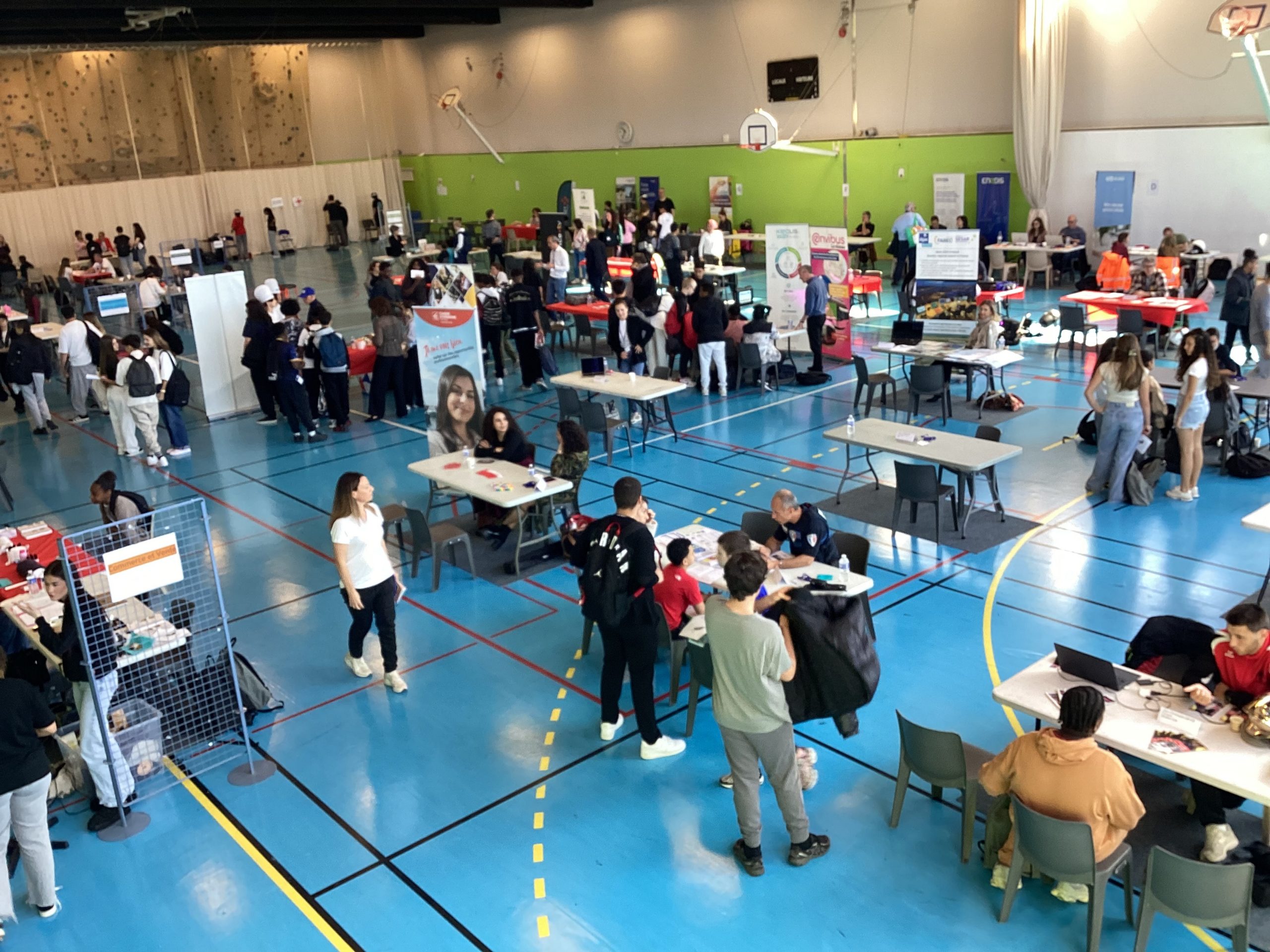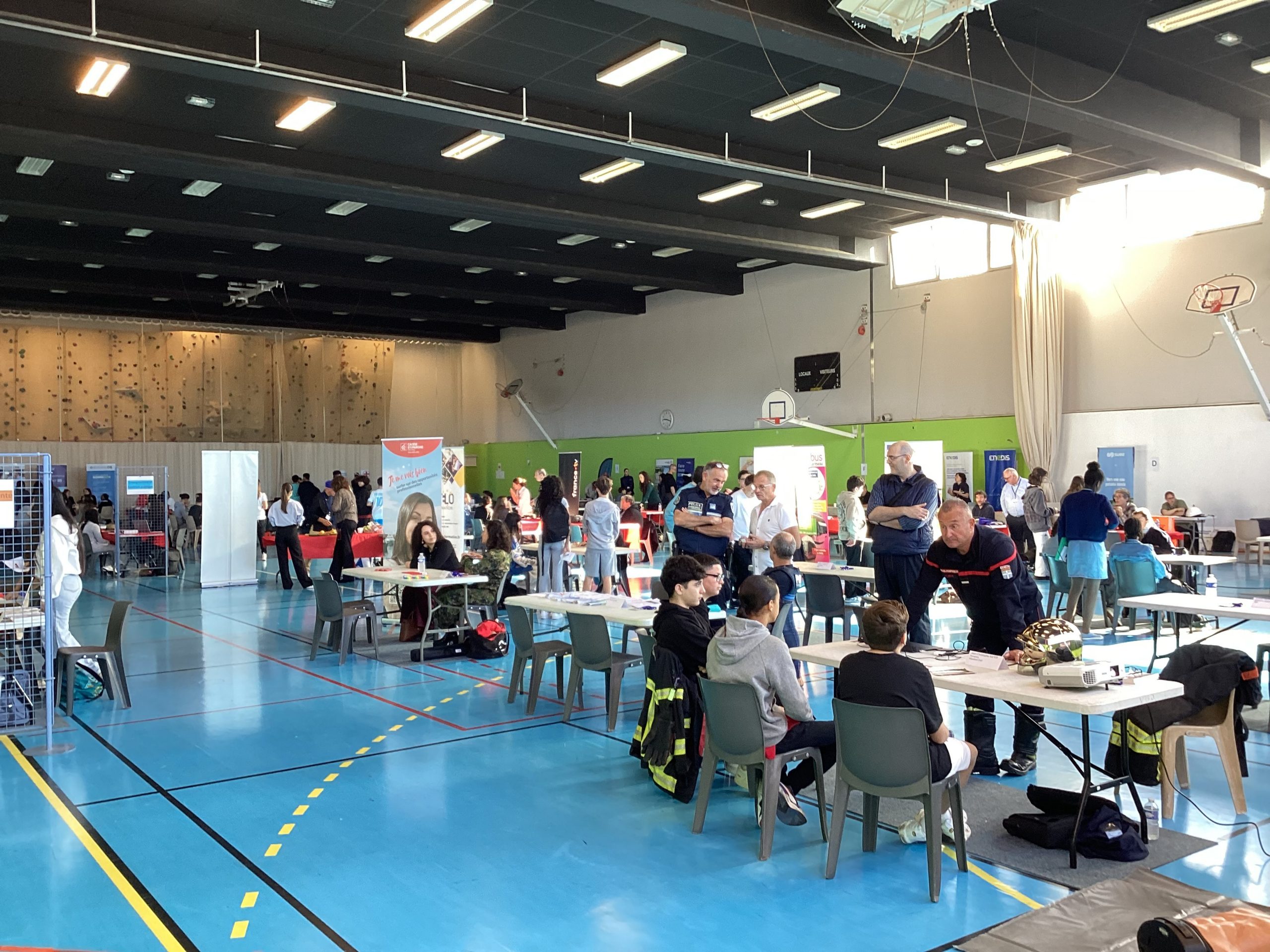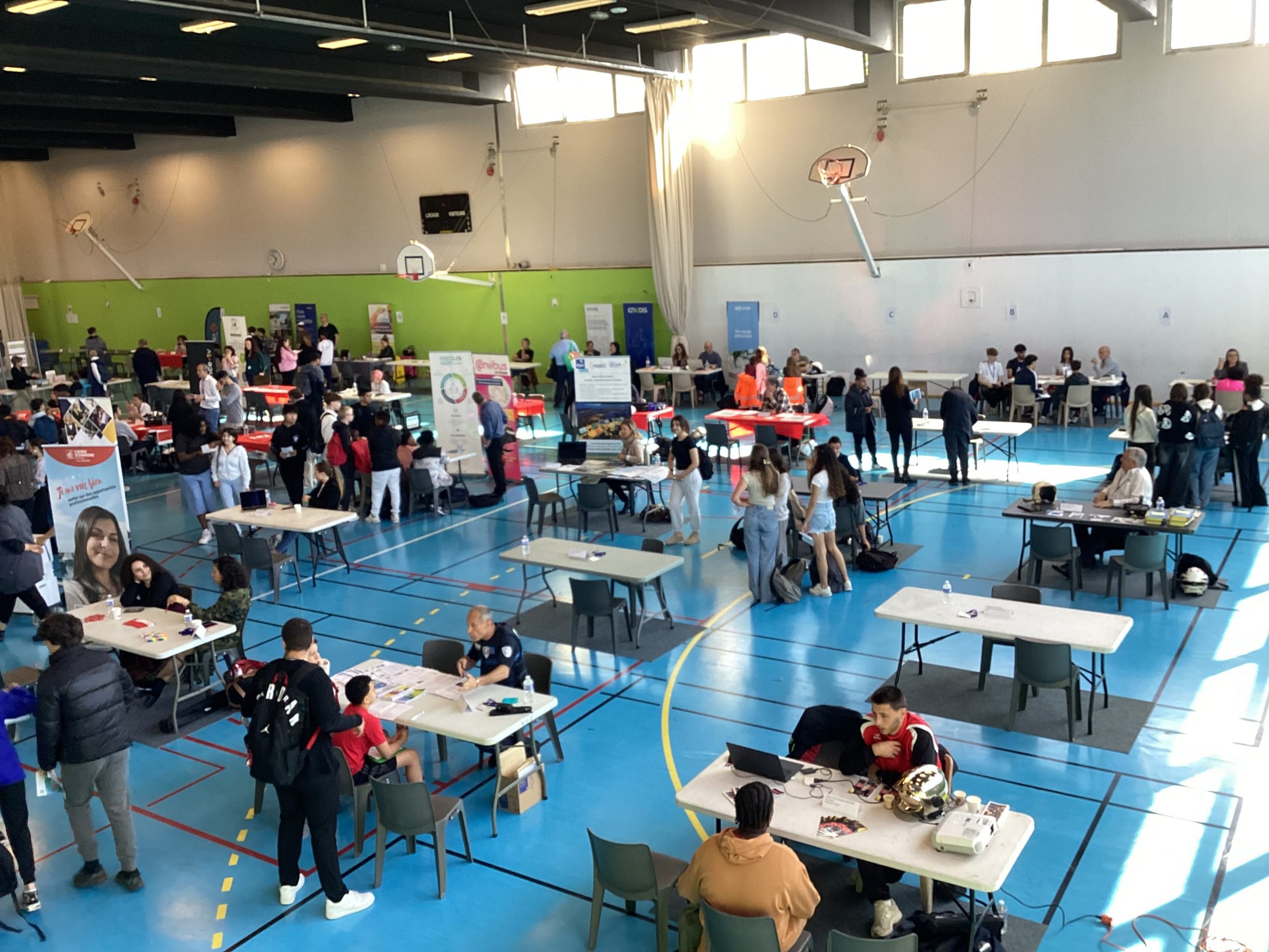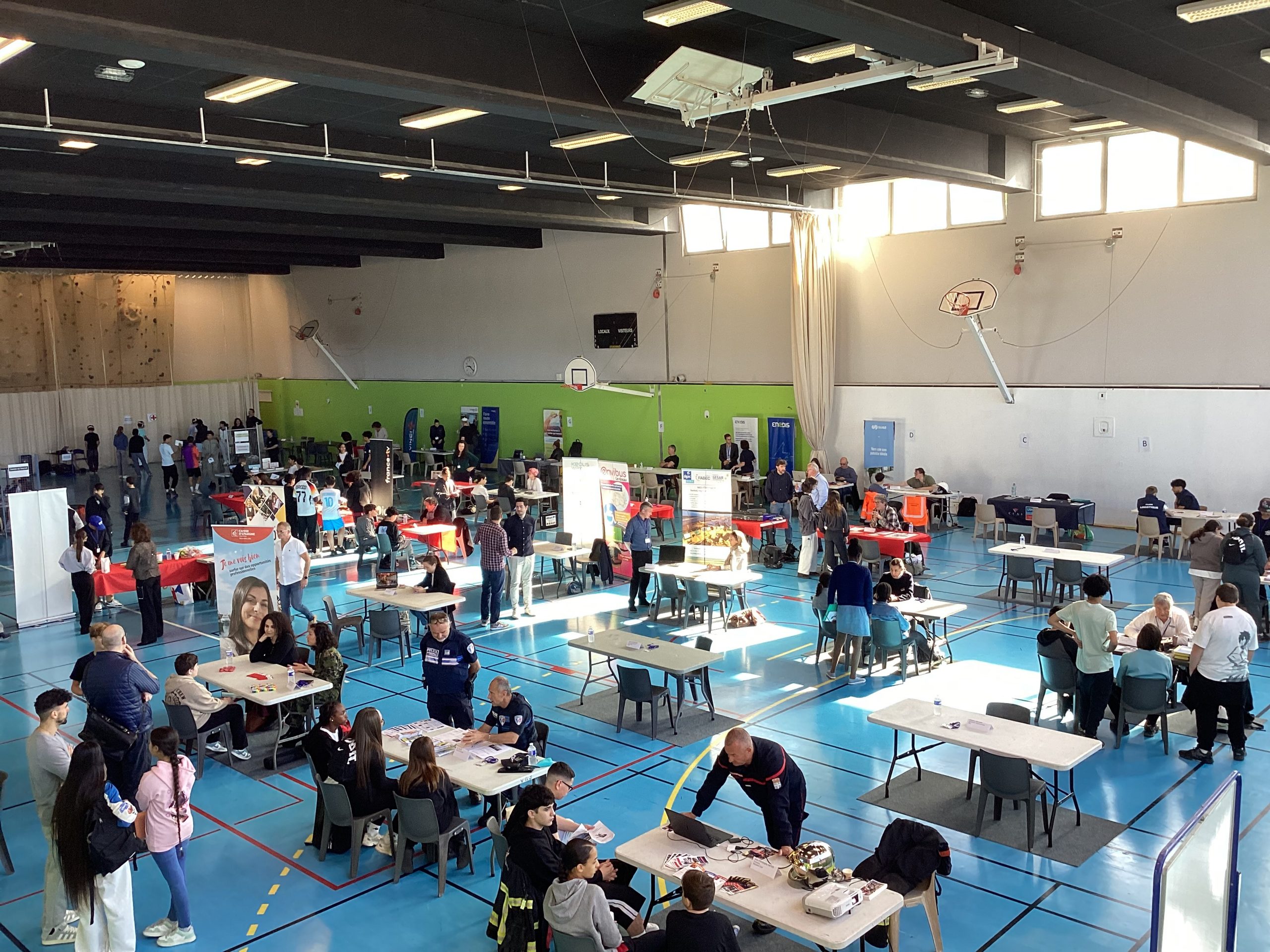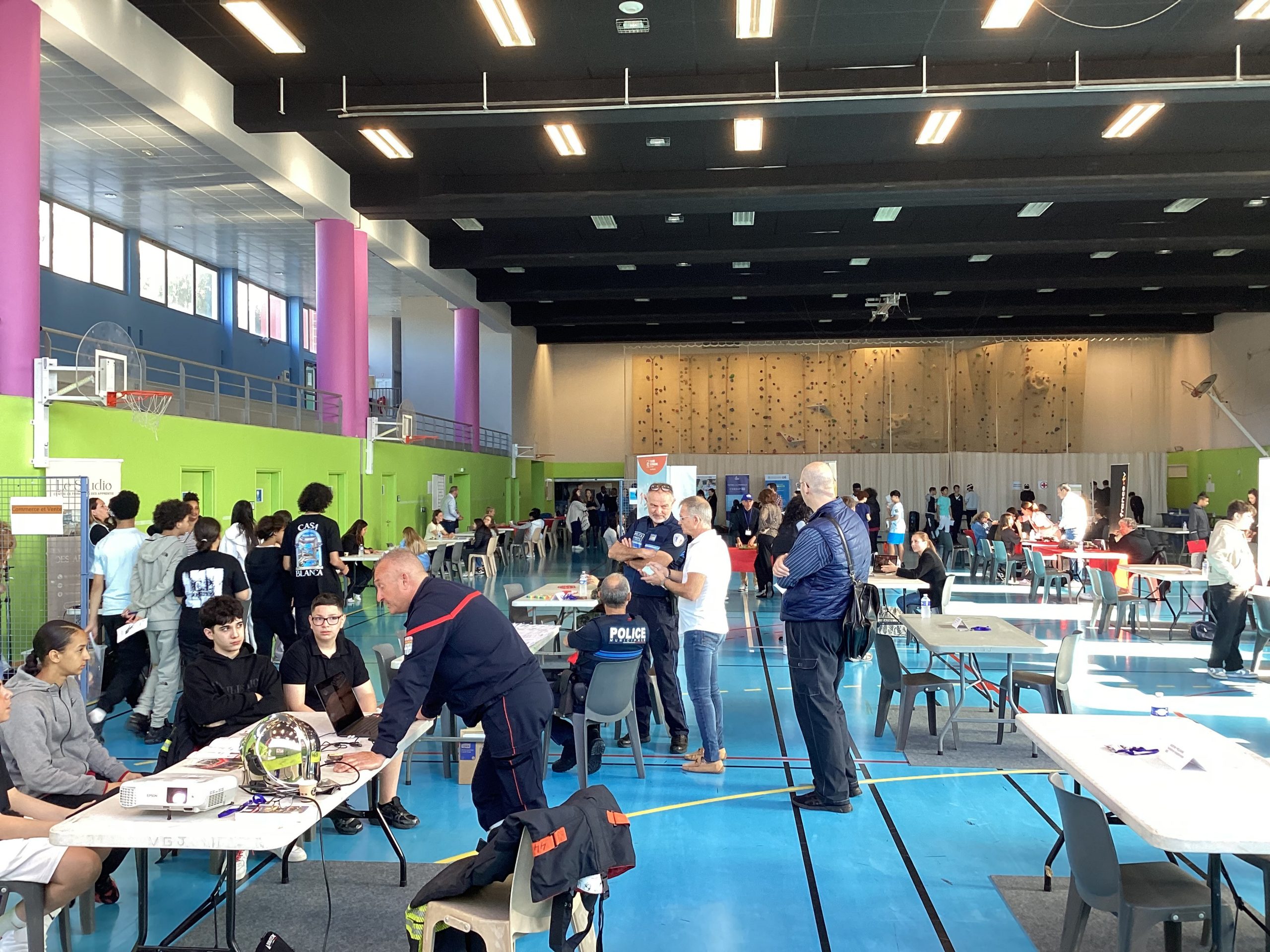 Le jeudi 24 avril au matin, un projet de belle ampleur a eu lieu au collège Pablo Picasso de Vallauris. Afin de parfaire le parcours préprofessionnel des élèves de 4ème ainsi que quelques élèves de 3ème, ceux-ci (au nombre approximatif de 200), ont été conviés à se rendre au gymnase de l’établissement pour aller à la rencontre de professionnels. Une soixantaine d’intervenants, regroupés par stands, et dont la variété des emplois proposés (des métiers de l’électricité à ceux de la vente et du commerce, de l’esthétisme à l’ostéopathie, du journalisme à l’architecture, du numérique à l’ébénisterie en passant par la gestion bancaire, la librairie, la police et les pompiers) permet de couvrir le très large spectre des offres possibles.