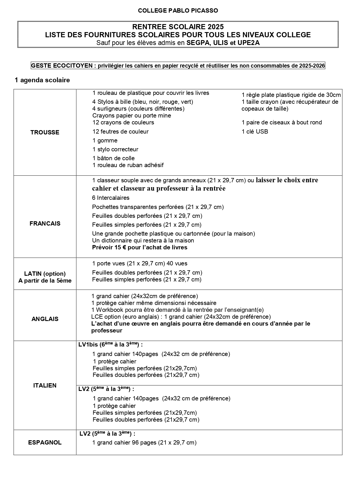 Ci-dessus : liste des fournitures pour tous les élèves (sauf SEGPA, ULIS et UPE2A). Il y a deux pages.