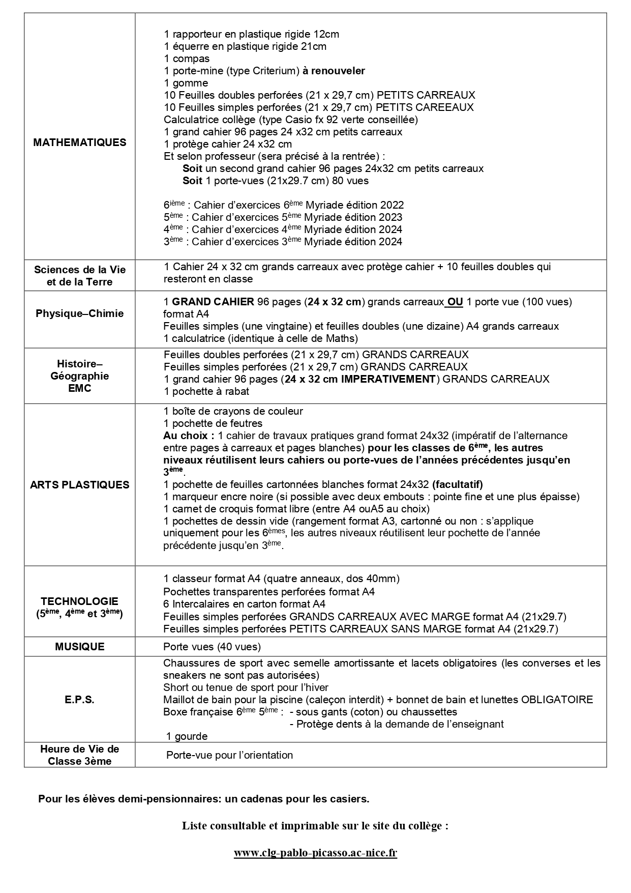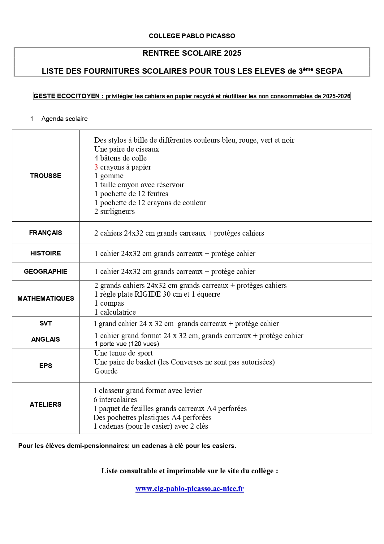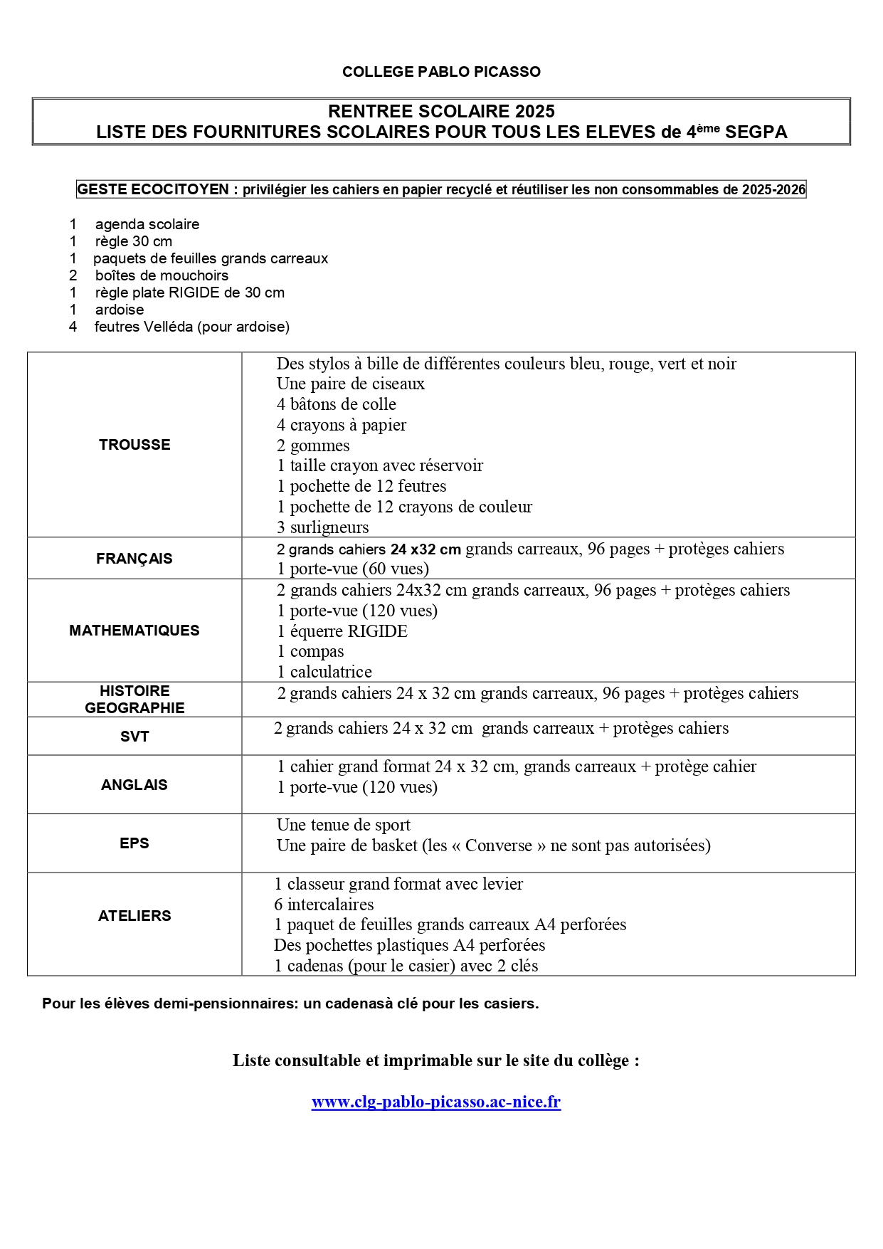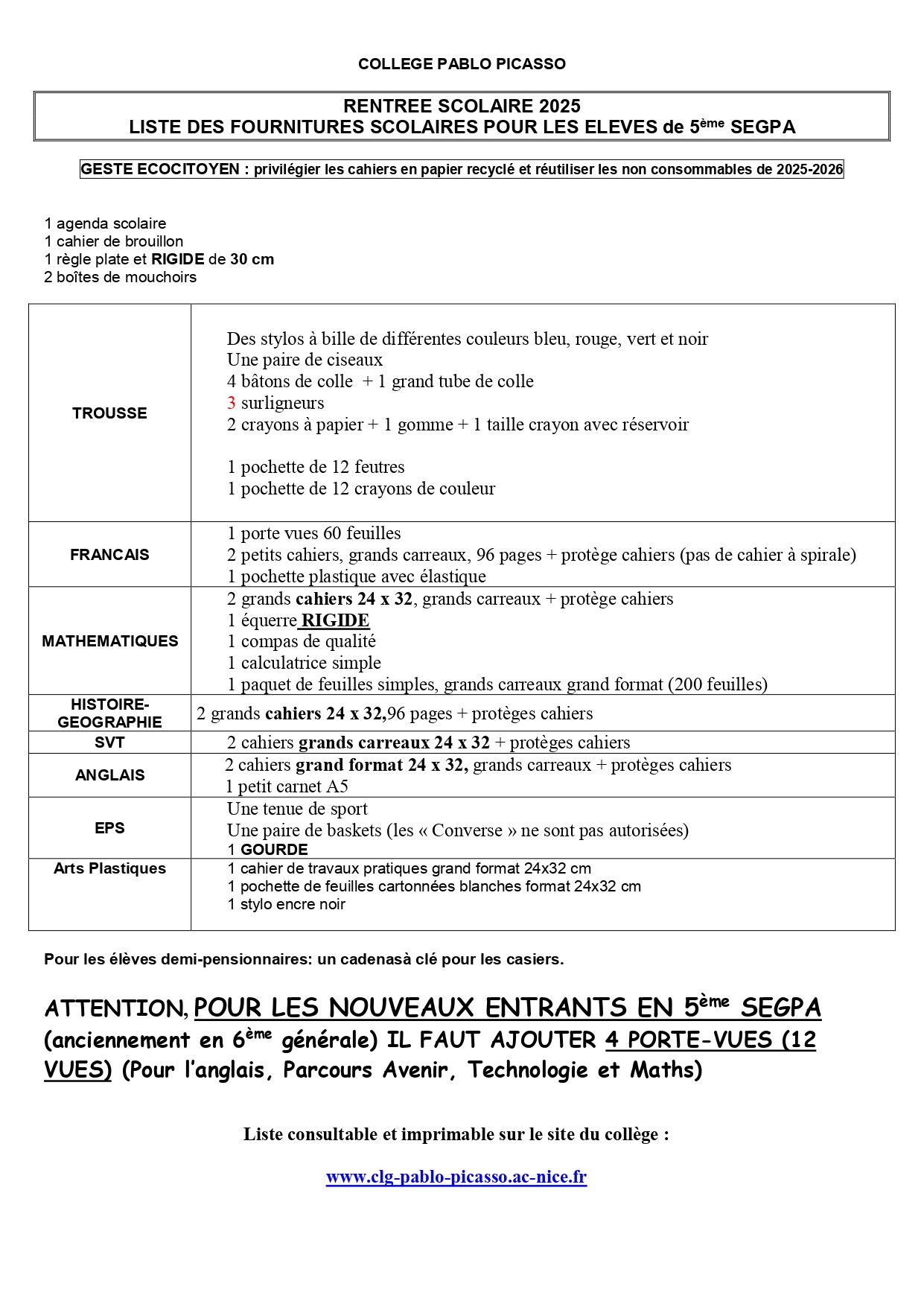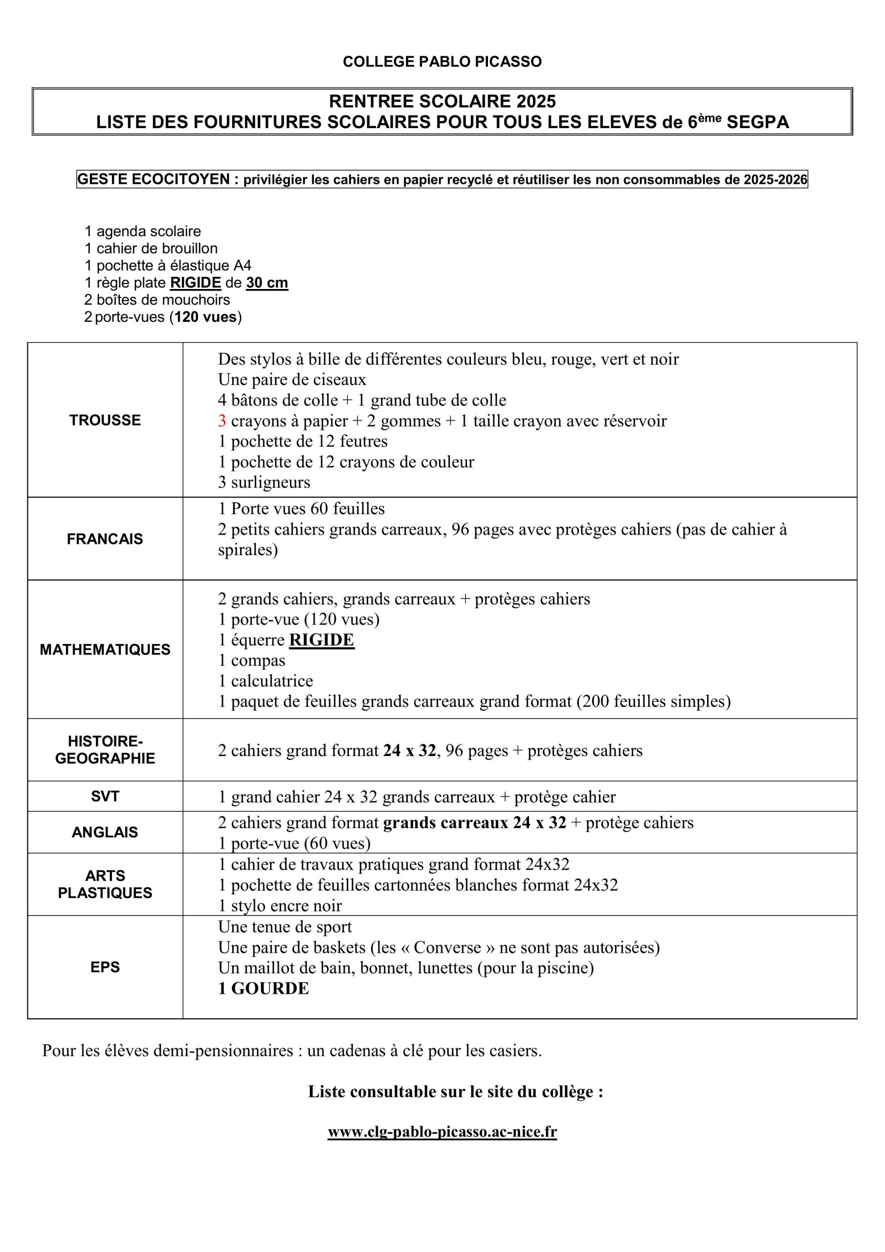 Ci-dessus : liste des fournitures pour les élèves de SEGPA (6ème, 5ème, 4ème puis 3ème).