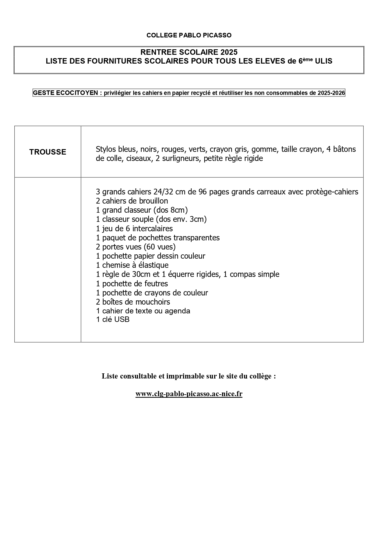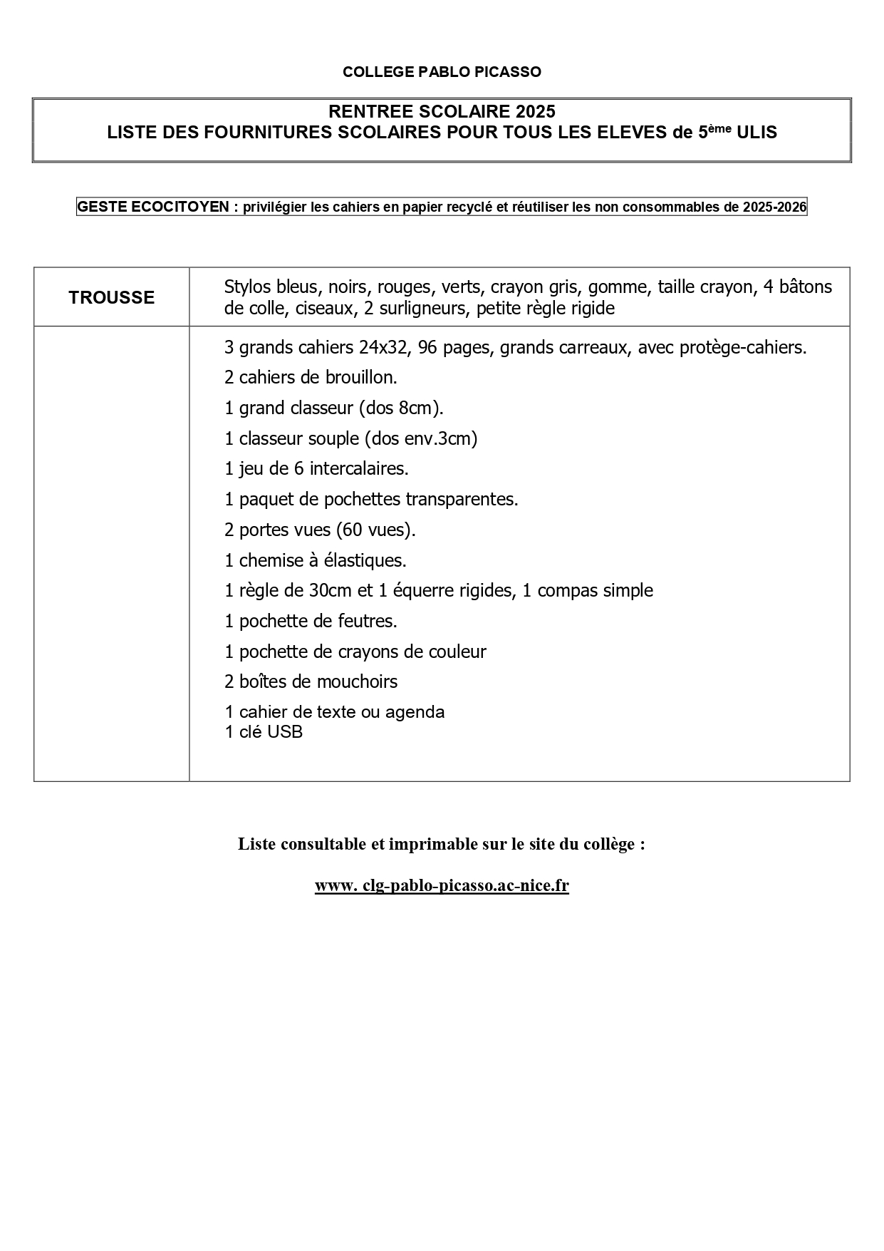 Ci-dessus : liste des fournitures pour les élèves d’ULIS (6ème, 5ème, puis 4ème/3ème).