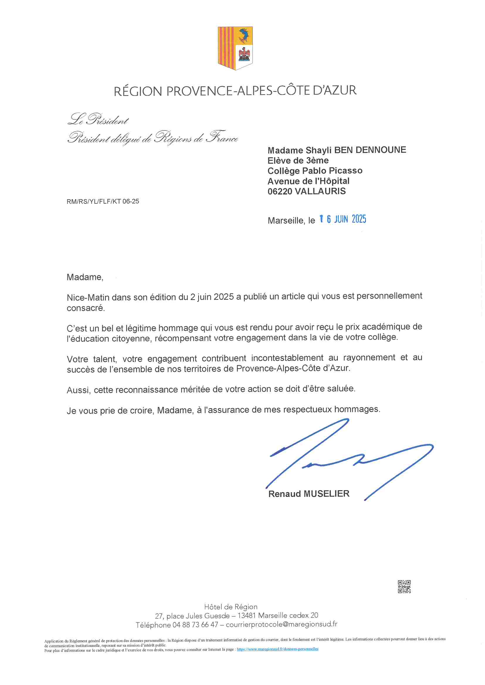 Monsieur Renaud Muselier félicite une de nos élèves ! Le Président de la Région Provence-Alpes-Côte d’Azur, Monsieur Renaud Muselier, félicite notre lauréate du Prix Académique de l’Education Citoyenne. Cliquez sur le courrier pour l’agrandir.