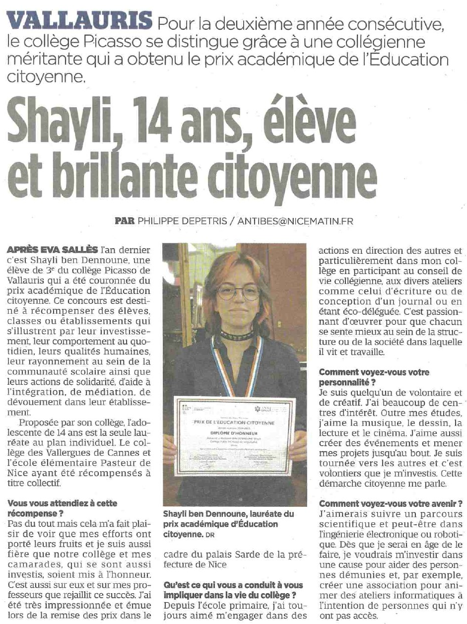 Notre lauréate du Prix académique de l’éducation citoyenne a droit aux honneurs de Nice Matin ! Notre élève Shayli Ben Dennoune a été interviewée par Nice Matin. Cliquez sur l’article pour l’agrandir.